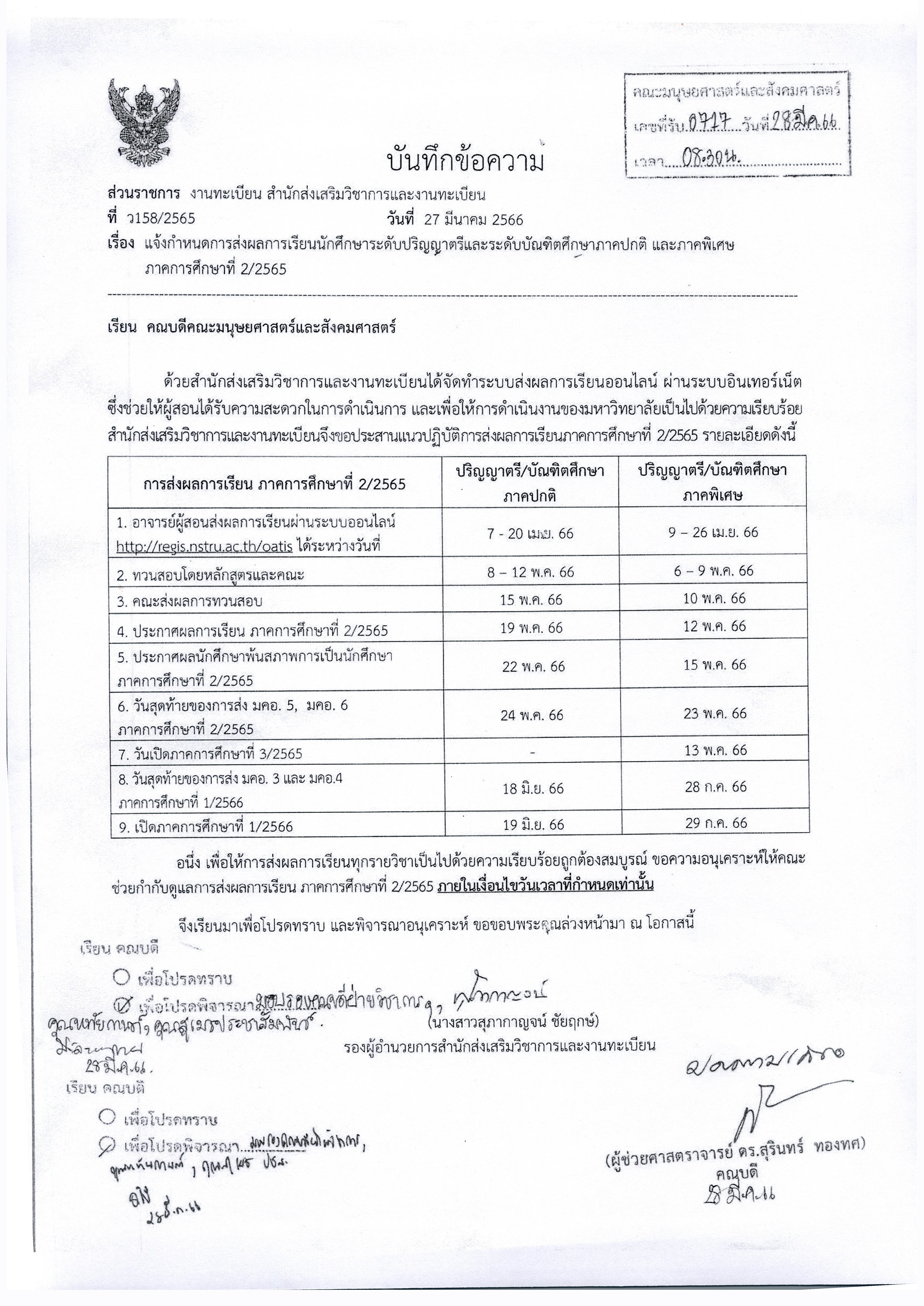 แจ้งกำหนดการส่งผลการเรียนนักศึกษาระดับปริญญาตรีและระดับบัณฑิตศึกษาภาคปกติ และภาคพิเศษ