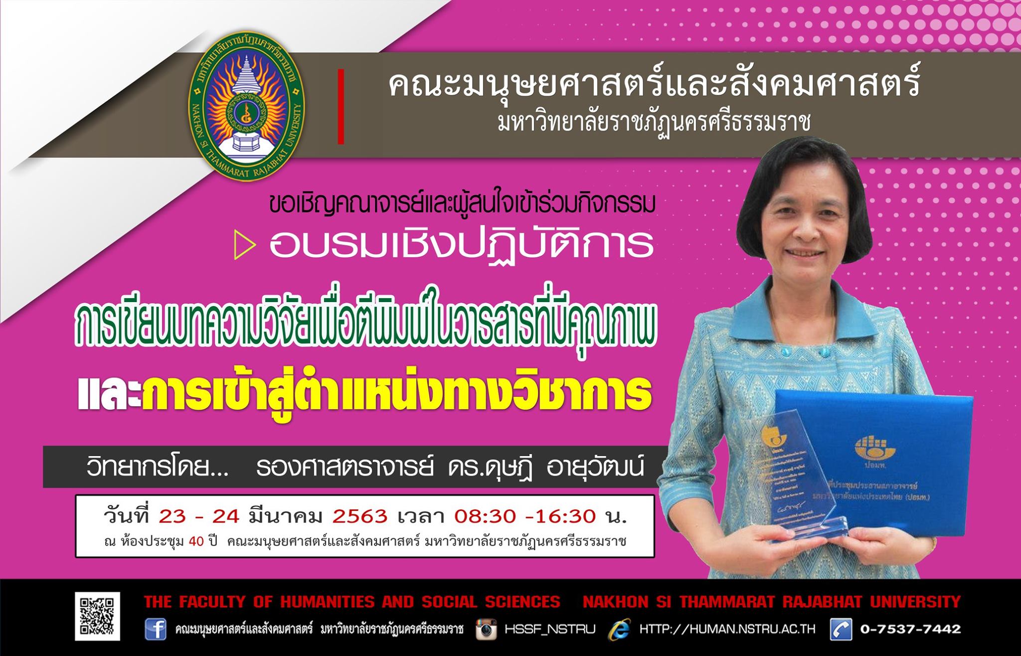 ประชาสัมพันธ์กิจกรรมโครงการอบรมเชิงปฏิบัติการ "การเขียนบทความวิจัยเพื่อตีพิทพ์ในวารสารที่มีคุณภาพและเพื่อเข้าสู่ตำแหน่งทางวิชาการ" วิทยากรโดย รองศาสตราจารย์ ดร.ดุษฎี อายุวัฒน์ วันที่ 23 - 24 มีนาคม 2563 เวา 08.30-17.30 น. ณ ห้องประชุม 40 ปี อาคาร 4 ชั้น 2