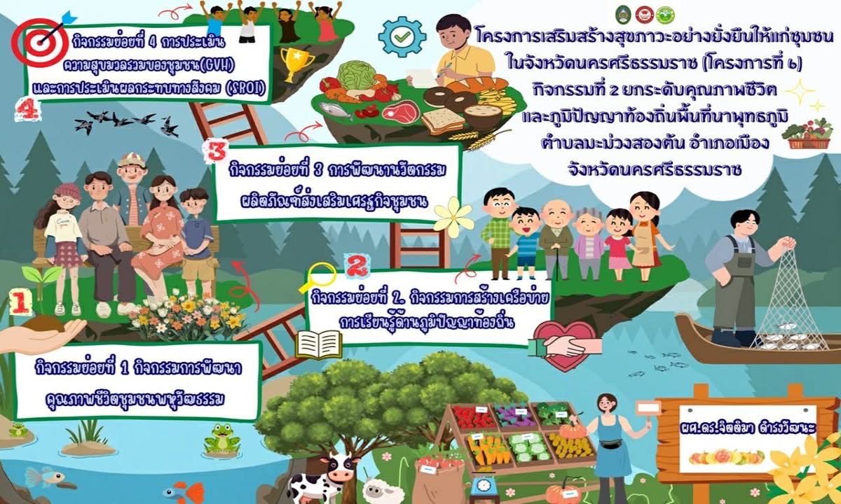 โครงการยกระดับคุณภาพชีวิตและภูมิปัญญาท้องถิ่นพื้นที่นาพุทธภูมิ อำเภอเมือง จังหวัดนครศรีธรรมราช ซึ่งผู้ช่วยศาสตราจารย์ ดร.จิตติมา ดำรงวัฒนะ เป็นหัวหน้าโครงการ นับเป็นกิจกรรมหนึ่งในโครงการดังกล่าวที่มีเป้าหมายการดำเนินงานในพื้นที่ขององค์การบริหารส่วนตำบลมะม่วงสองต้น