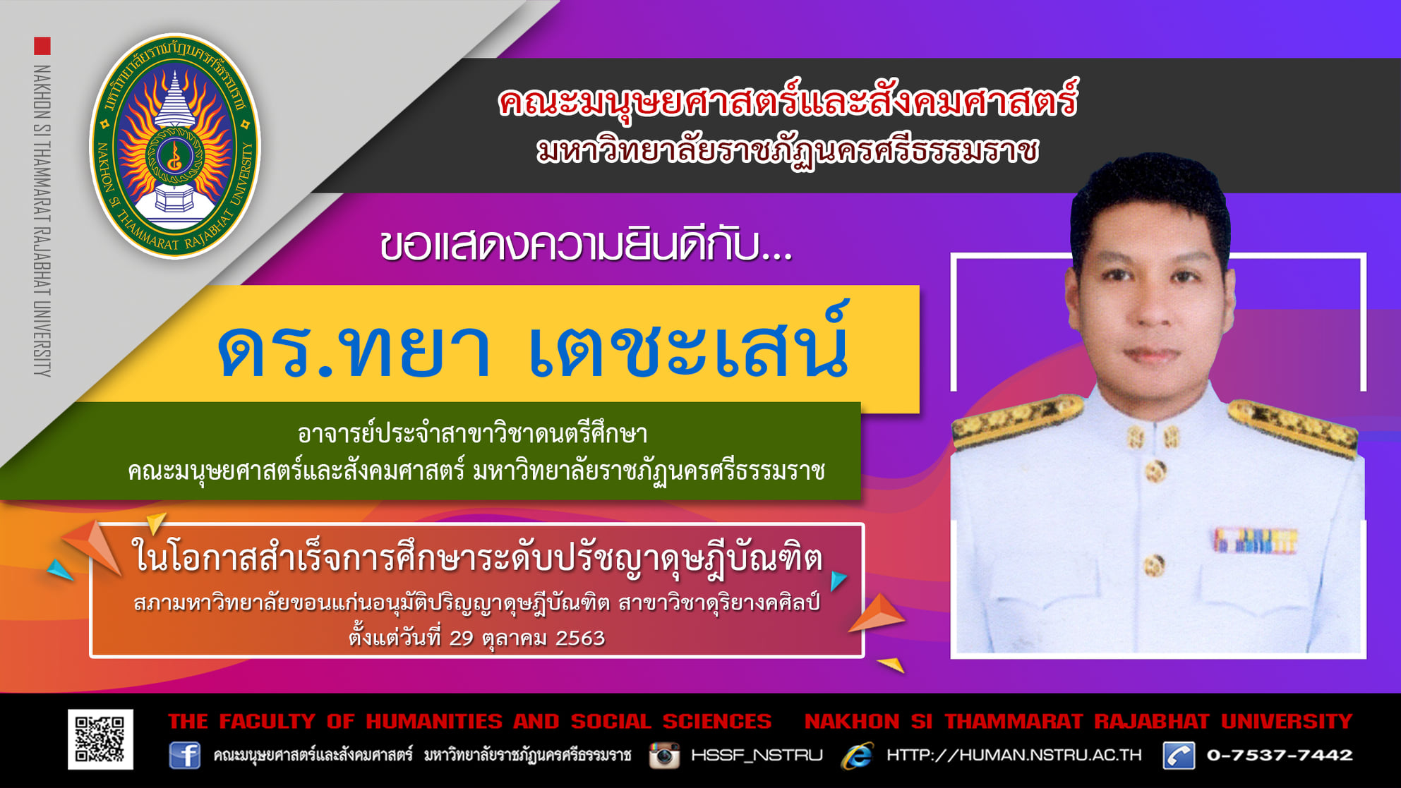 ขอแสดงความยินดีกับ... "ดร.ทยา เตชะเสน์" อาจารย์ประจำสาขาวิชาดนตรี คณะมนุษยศาสตร์และสังคมศาสตร์ มหาวิทยาลัยราชภัฏนครศรีธรรมราช เนื่องในโอกาสสำเร็จการศึกษาระดับดุษฎิบัณฑิต สภามหาวิทยาลัยขอนแก่นอนุมัติปริญญาดุษฎีบัณฑิต สาขาวิชาดุริยางคศิลป์ ตั้งแต่วันที่ 29