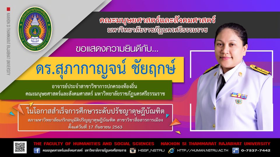 ขอแสดงความยินดีกับ... "ดร.สุภากาญจน์ ชัยฤกษ์" อาจารย์ประจำสาขาวิชาการปกครองท้องถิ่น คณะมนุษยศาสตร์และสังคมศาสตร์ มหาวิทยาลัยราชภัฏนครศรีธรรมราช เนื่องในโอกาสสำเร็จการศึกษาระดับดุษฎิบัณฑิต สภามหาวิทยาลัยเกริกอนุมัติปริญญาดุษฎีบัณฑิต สาขาวิชาดุริยางคศิลป์ ต