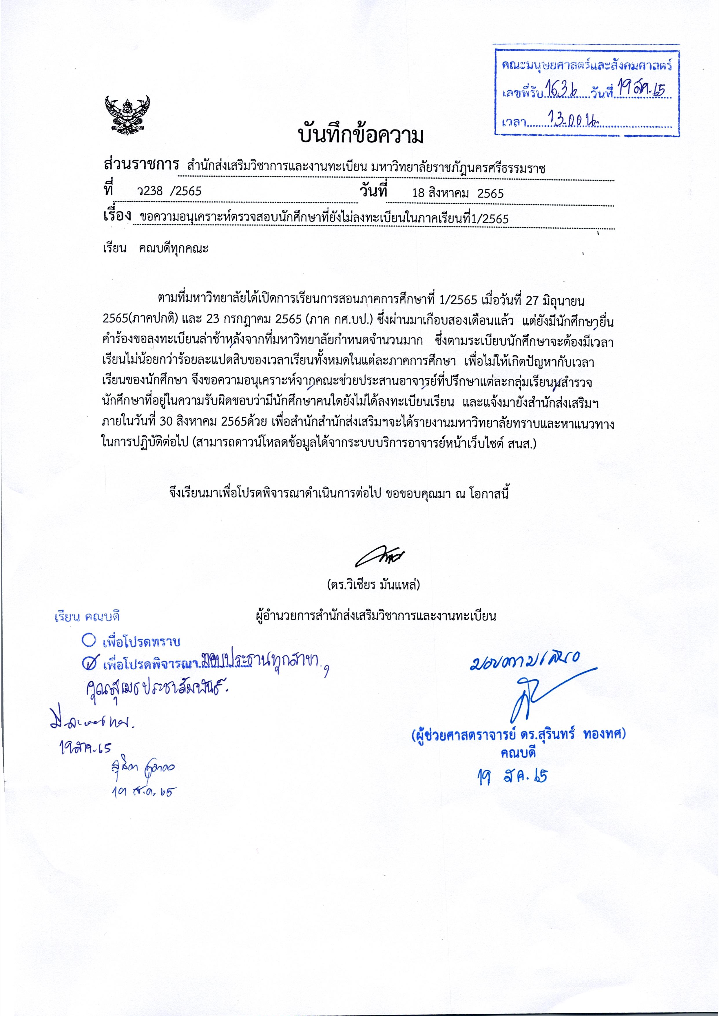 ขอความอนุเคราะห์ตรวจสอบนักศ฿กษาที่ยังไม่ลงทะเบียนในภาคเรียนที่ 1/ 2565
