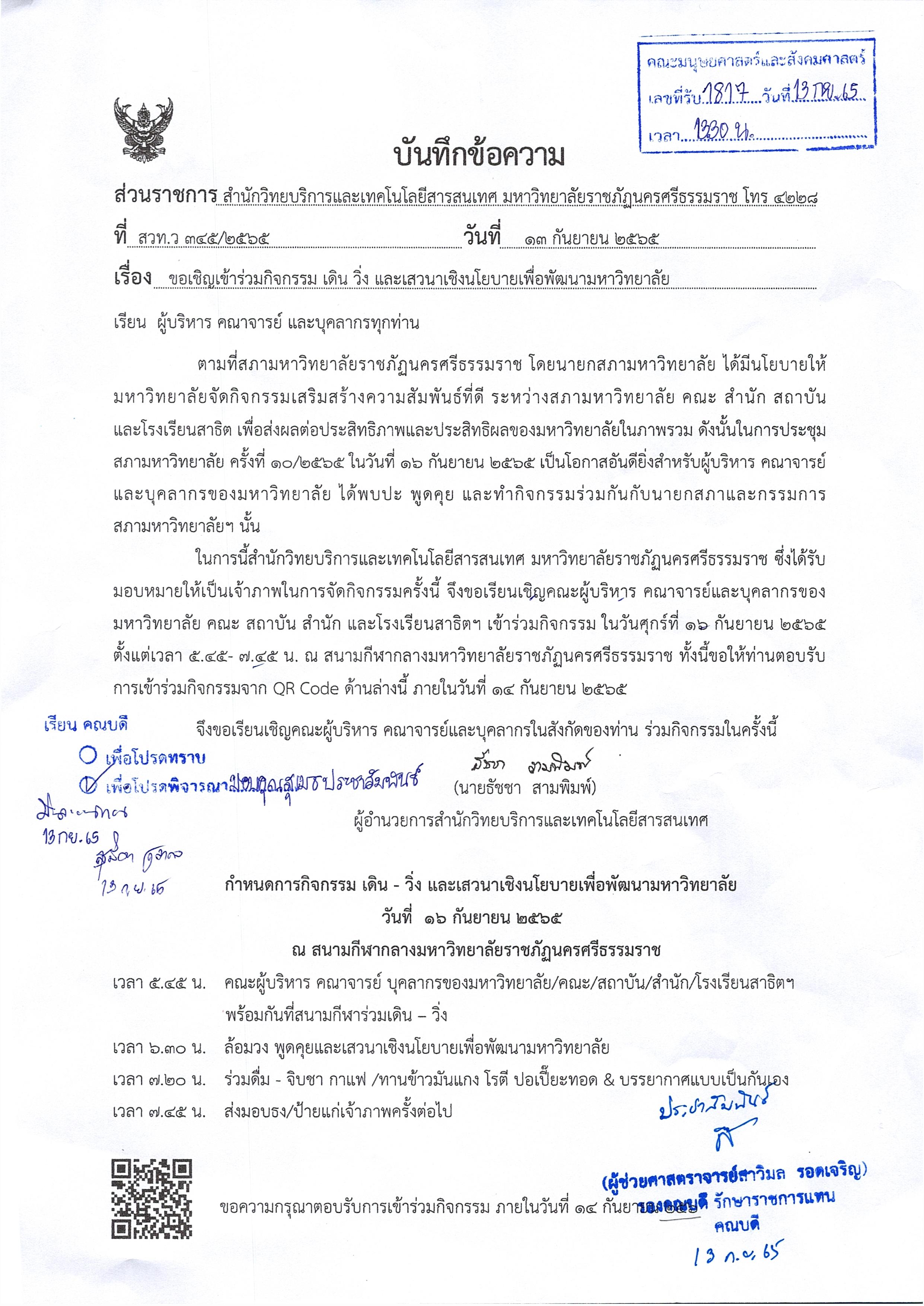 ขอเชิญเข้าร่วมกิจกรรม เดินวิ่ง และเสวนาเชิงนโยบายเพื่อพัฒนามหาวิทยาลัย