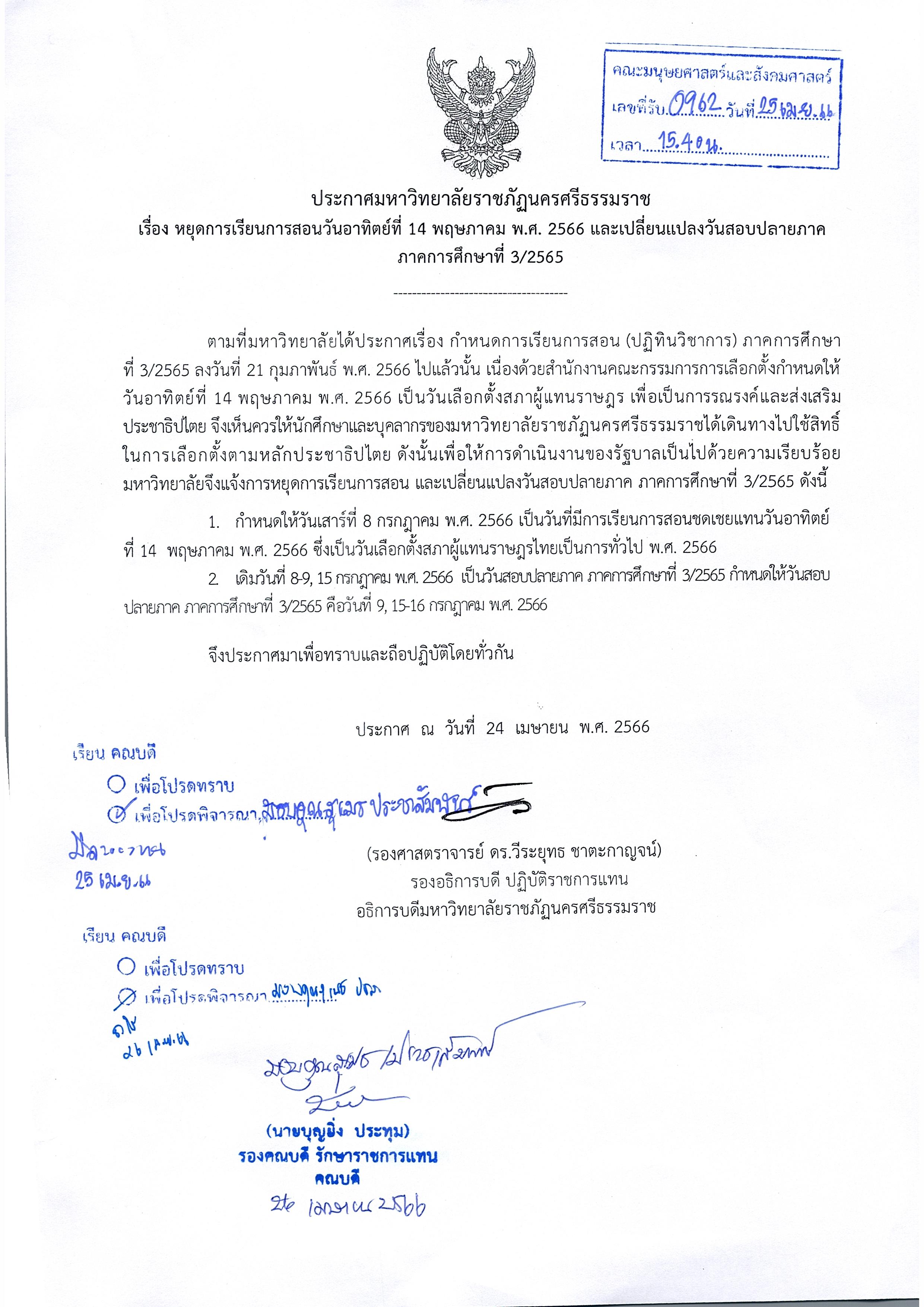 ประกาศมหาวิทยาลัยราชภัฏนครศรีธรรมราช เรื่องหยุดการเรียนการสอนวันอาทิตย์ที่ 14 พฤษภาคม พ.ศ.2566 และเปลี่ยนแปลงวันสอบปลายภาค ภาคการศึกษาที่ 3 2565