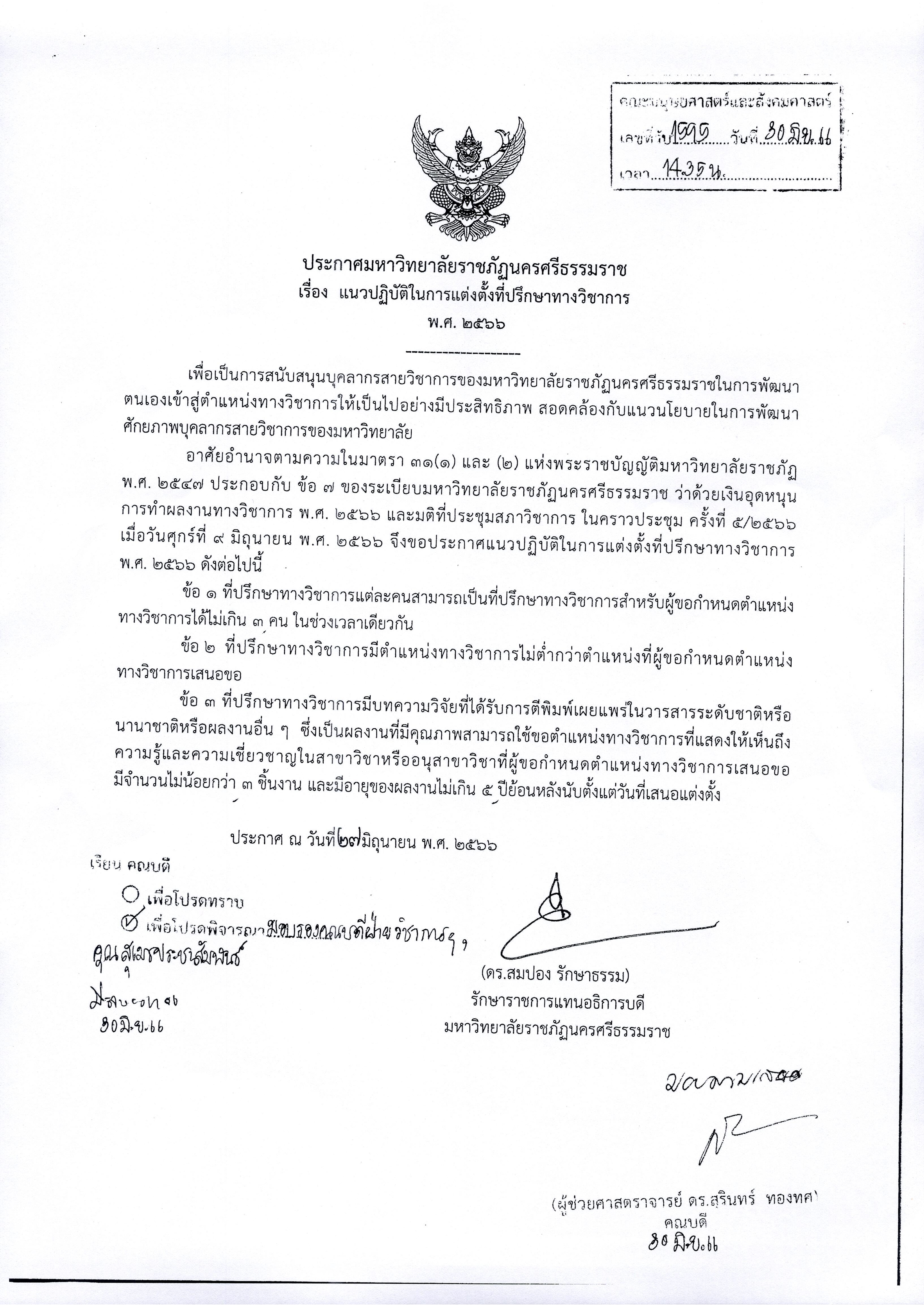 ประกาศมหาวิทยาลัยราชภัฏนครศรีธรรมราช เรื่องแนวปฏิบัติในการแต่งตั้งที่ปรึกษาทางวิชาการ พ.ศ.2566_0001