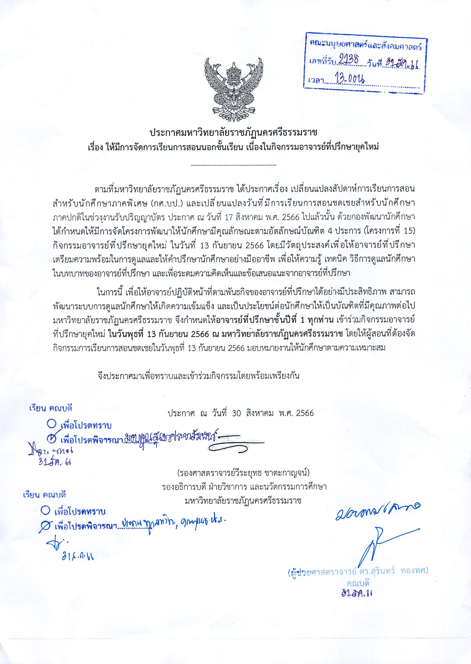 ประกาศมหาวิทยาลัยราชภัฏนครศรีธรรมราช เรื่อง ให้มีการจัดการเรียนการสอนนอกชั้นเรียน เนื่องในกิจกรรมอาจารย์ที่ปรึกษายุคใหม่