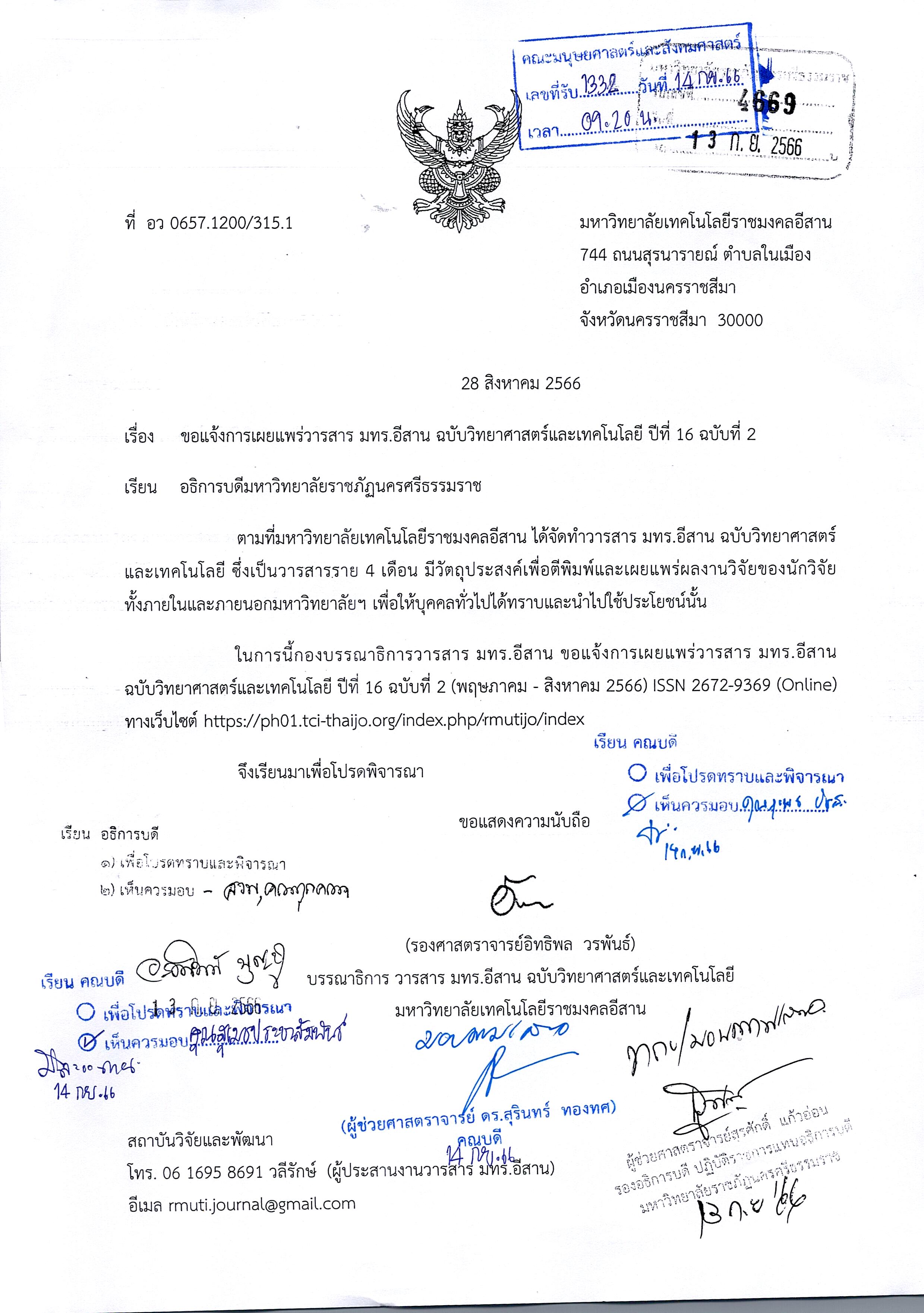 ขอแจ้งการเผยแพร่วารสาร มทร.อีสาน ฉบับวิทยาศาสตร์และเทคโนโลยี ปีที 16 ฉบับที่2