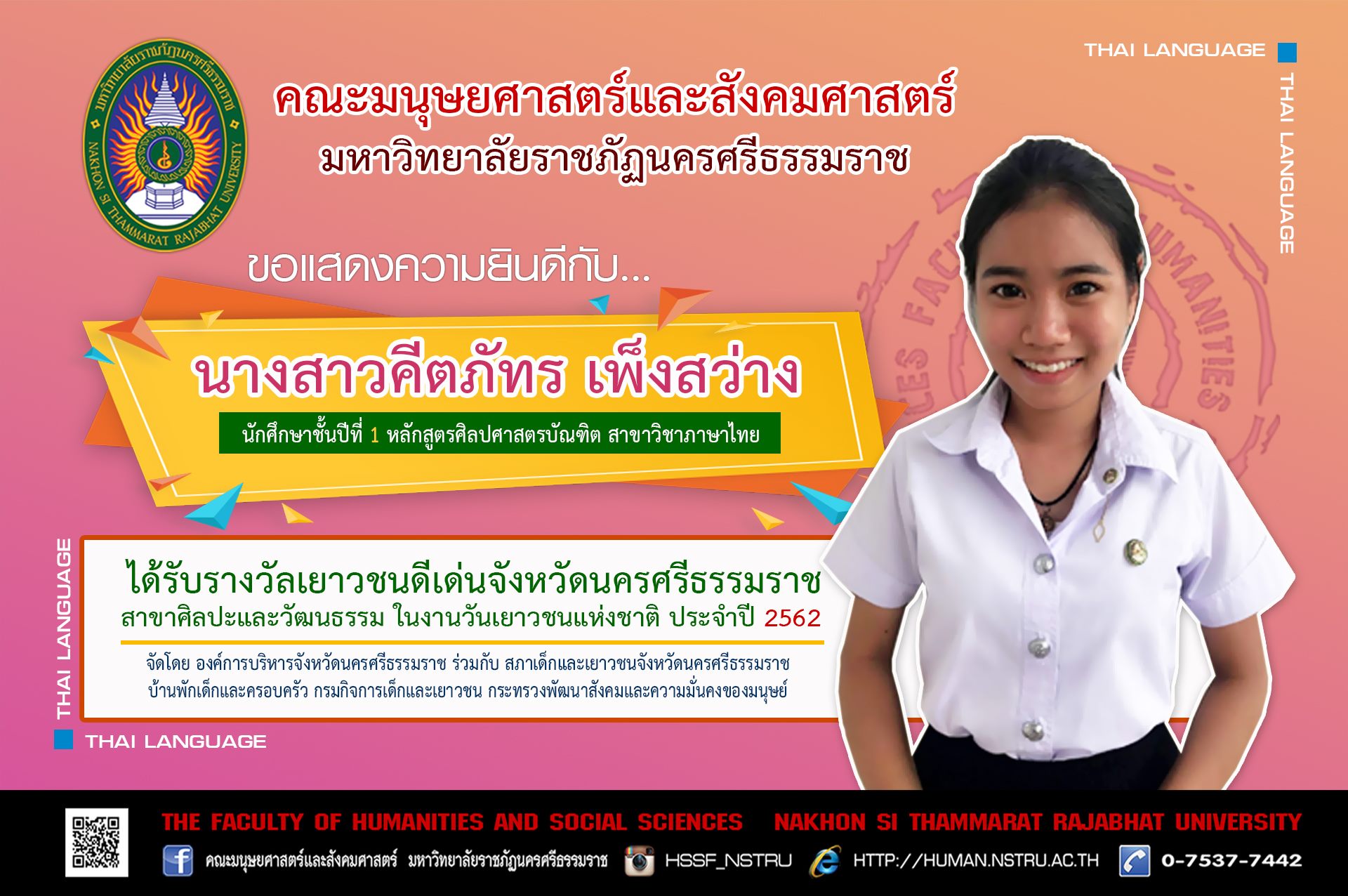 คณะมนุษยศาสตร์และสังคมศาสตร์ มหาวิทยาลัยราชภัฏนครศรีธรรมราช ขอแสดงความยินดีกับ.... นางสาวคีตภัทร เพ็งสว่าง นักศึกษาชั้นปีที่ 1หลักสูตรศิลปศาสตรบัณฑิต สาขาวิชาภาษาไทย คณะมนุษยศาสตร์และสังคมศาสตร์ มหาวิทยาลัยราชภัฏนครศรีธรรมราช ได้รับรางวัลเยาวชนดีเด่นจังหว