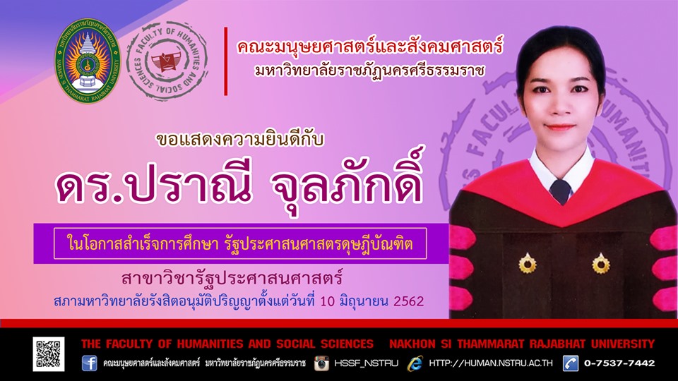 คณะมนุษยศาสตร์และสังคมศาสตร์ มหาวิทยาลัยราชภัฏนครศรีธรรมราช ขอแสดงความยินดีกับ... "ดร.ปราณี จุลภักดิ์" เนื่องในโอกาสสำเร็จการศึกษา รัฐประศาสนศาสตรดุษฎีบัณฑิต สาขาวิชารัฐประศาสนศาสตร์ มหาวิทยาลัยรังสิตอนุมัติปริญญาตั้งแต่วันที่ 10 มิถุนายน 2562 #คนของเราคณ