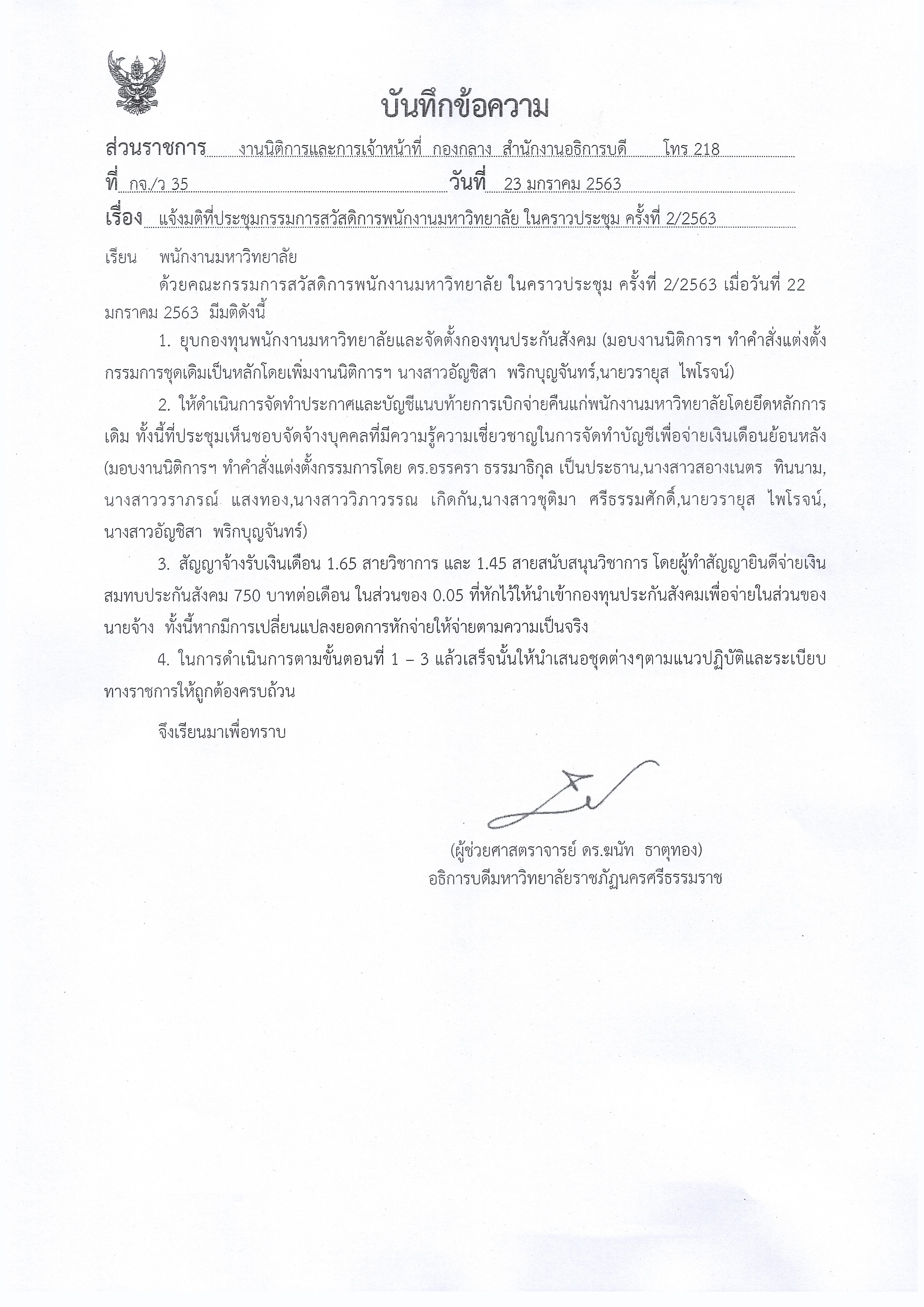 แจ้งมติที่ประชุมกรรมการสวัสดิการพนักงานมหาวิทยาลัย ในคราวประชุม ครั้งที่ 2/2563