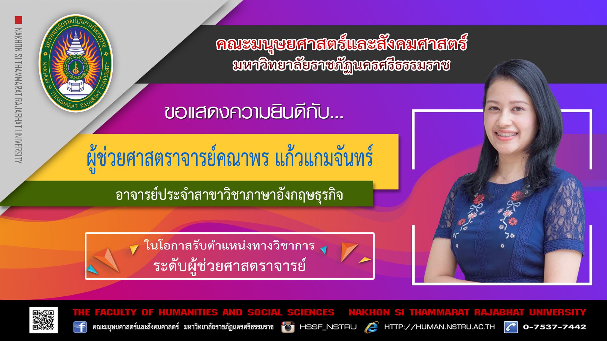 ขอแสดงความยินดีกับ... "ผู้ช่วยศาสตราจารย์คณาพร แก้วแกมจันทร์" อาจารย์ประจำสาขาวิชาภาษาอังกฤษธุรกิจ คณะมนุษยศาสตร์และสังคมศาสตร์ มหาวิทยาลัยราชภัฏนครศรีธรรมราช เนื่องในโอกาสรับตำแหน่งทางวิชาการระดับ "ผู้ช่วยศาสตราจารย์" #คนของเราคณะของเรามหาวิทยาลัยของเรา
