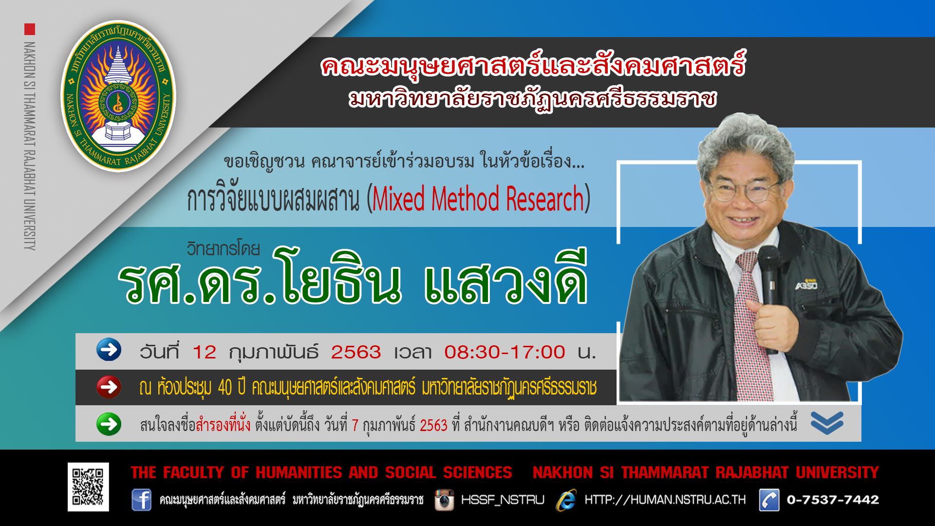 ประชาสัมพันธ์โครงการอบรม "การวิจัยแบบผสมผสาน Mixed Method Research" วิทยากรโดย รศ.ดร.โยธิน แสวงดี วันที่ 12 กุมภาพันธ์ 25633 เวา 08.30-17.30 น. ณ ห้องประชุม 40 ปี อาคาร 4 ชั้น 2 คณะมนุษยศาสตร์และสังคมศาสตร์ มหาวิทยาลัยราชภัฏนครศรีธรรมราช ***รับจำนวนจำกัดเ