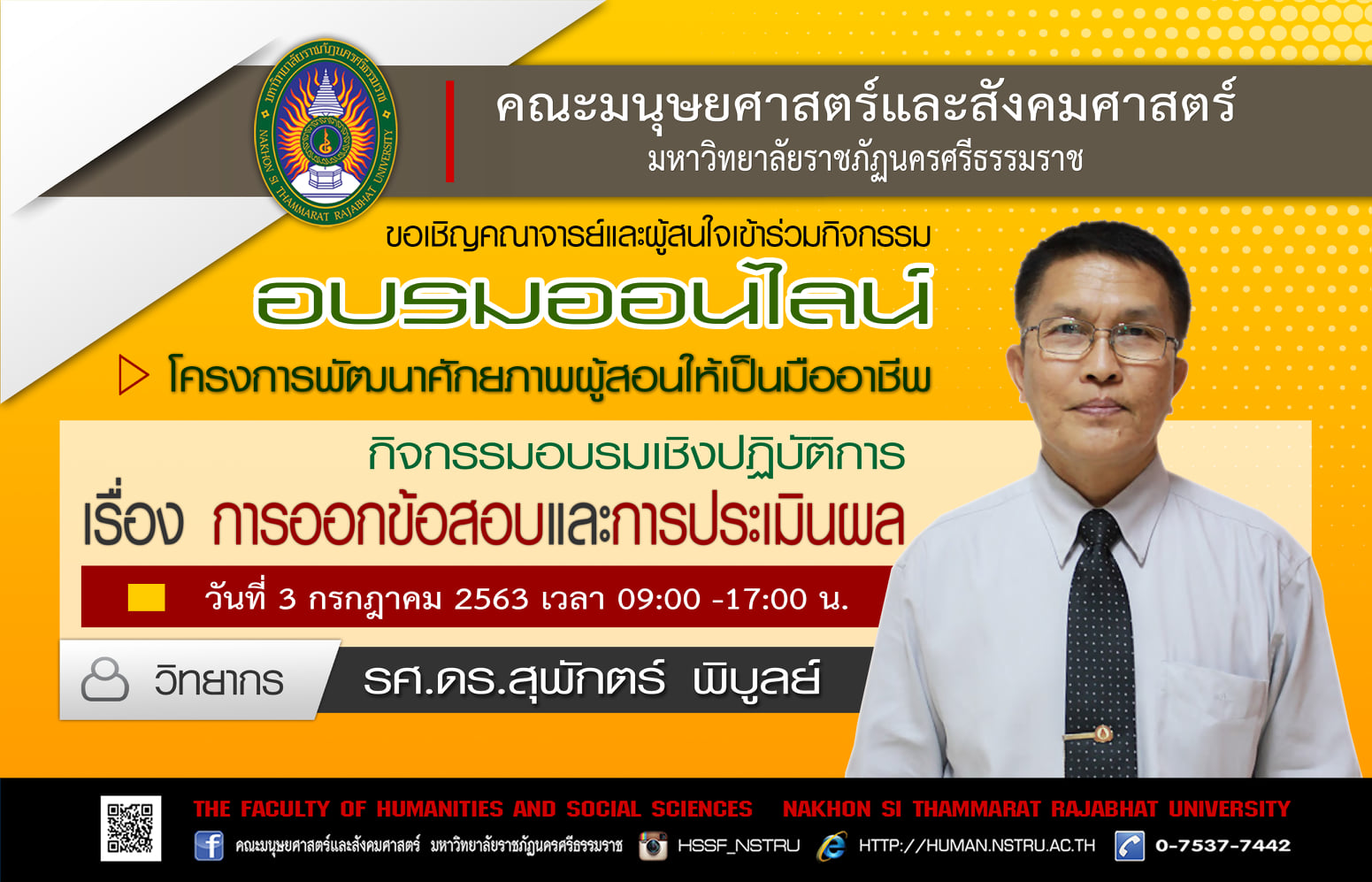 ประชาสัมพันธ์การอบรมออนไลน์... โครงการพัฒนาศักยภาพผู้สอนให้เป็นมืออาชีพ กิจกรรม อบรมเชิงปฏิบัติการ เรื่อง การออกข้อสอบและการประเมินผล วิทยากร... รศ.ดร.สุพักตร์ พิบูลย์ วันที่ 3 กรกฎาคม 2563 เวลา 09:00-17:00 น. จัดโดย คณะมนุษยศาสตร์และสังคมศาสตร์ มหาวิทยาล